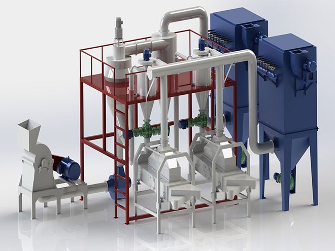 電池由輸送機送入一級撕碎機中進行撕碎,撕碎后的物料通過輸送機送入二級多刀破碎機中進行第二次破碎,二次破碎后的物料進入到輸送機中同時設(shè)置磁選設(shè)備,可以將物料中的鐵分選出來。分選后的物料經(jīng)輸送機送入氣流分選機,通過引風(fēng)機和旋風(fēng)下料器把正負極中的隔膜紙分離出來,把分選后的正負極片進入到三級粉碎機中進行細碎,將物料粉碎到20目左右。粉碎后的物料由負壓系統(tǒng)進入到旋風(fēng)分離器中進行粉塵過濾,并通過兩次氣流分選,使不同密度的物質(zhì)進行分層,然后得到正負極材料與銅、鋁、鎳等材料,而所有的超細粉塵由負壓系統(tǒng)帶入脈沖除塵器中進行收集。而過濾得到的尾氣將繼續(xù)由負壓系統(tǒng)送入到尾氣處理設(shè)備中進行空氣凈化,使之達到國家排放標(biāo)準(zhǔn)后再進行高空排放。
